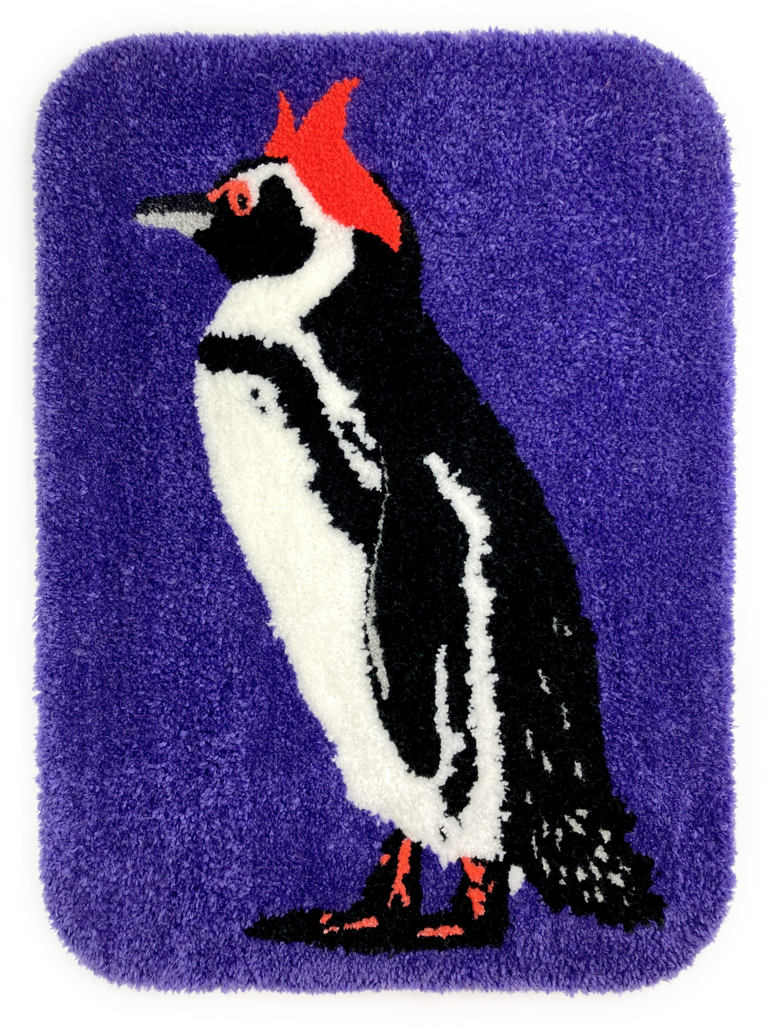 赤いリボンをつけたフンボルトペンギンのハンドメイドラグです。