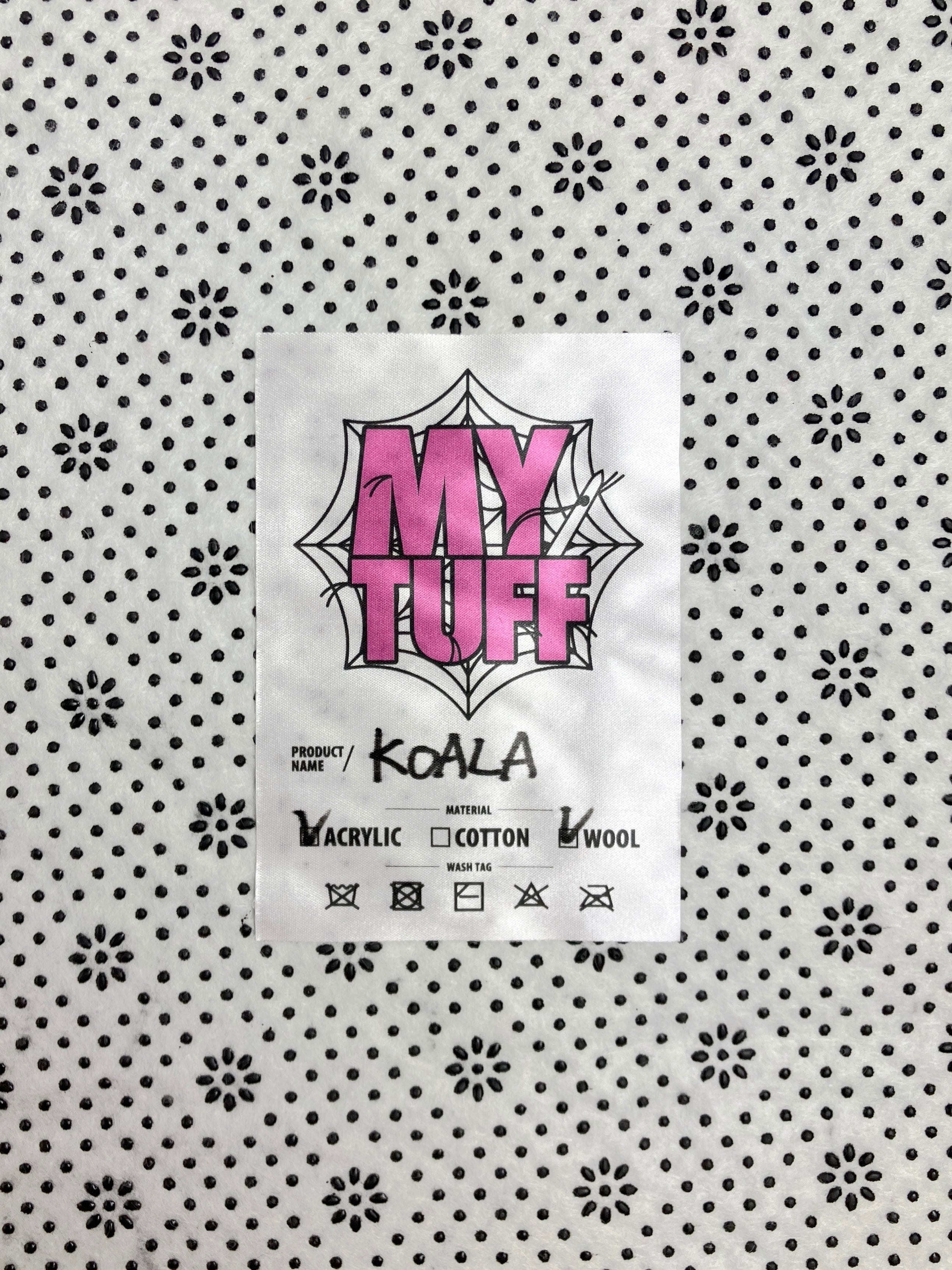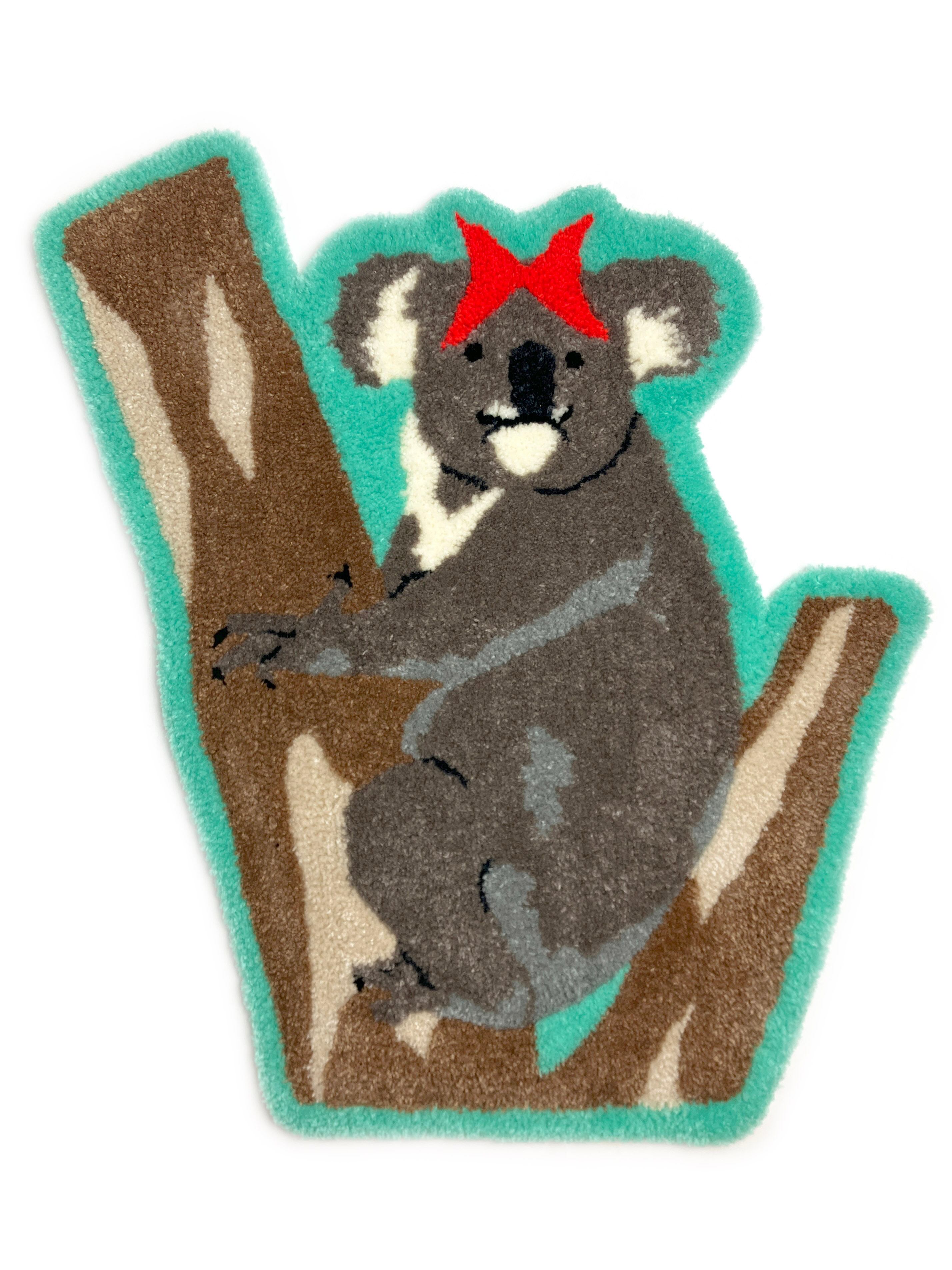 赤いリボンをつけたコアラのハンドメイドラグです。