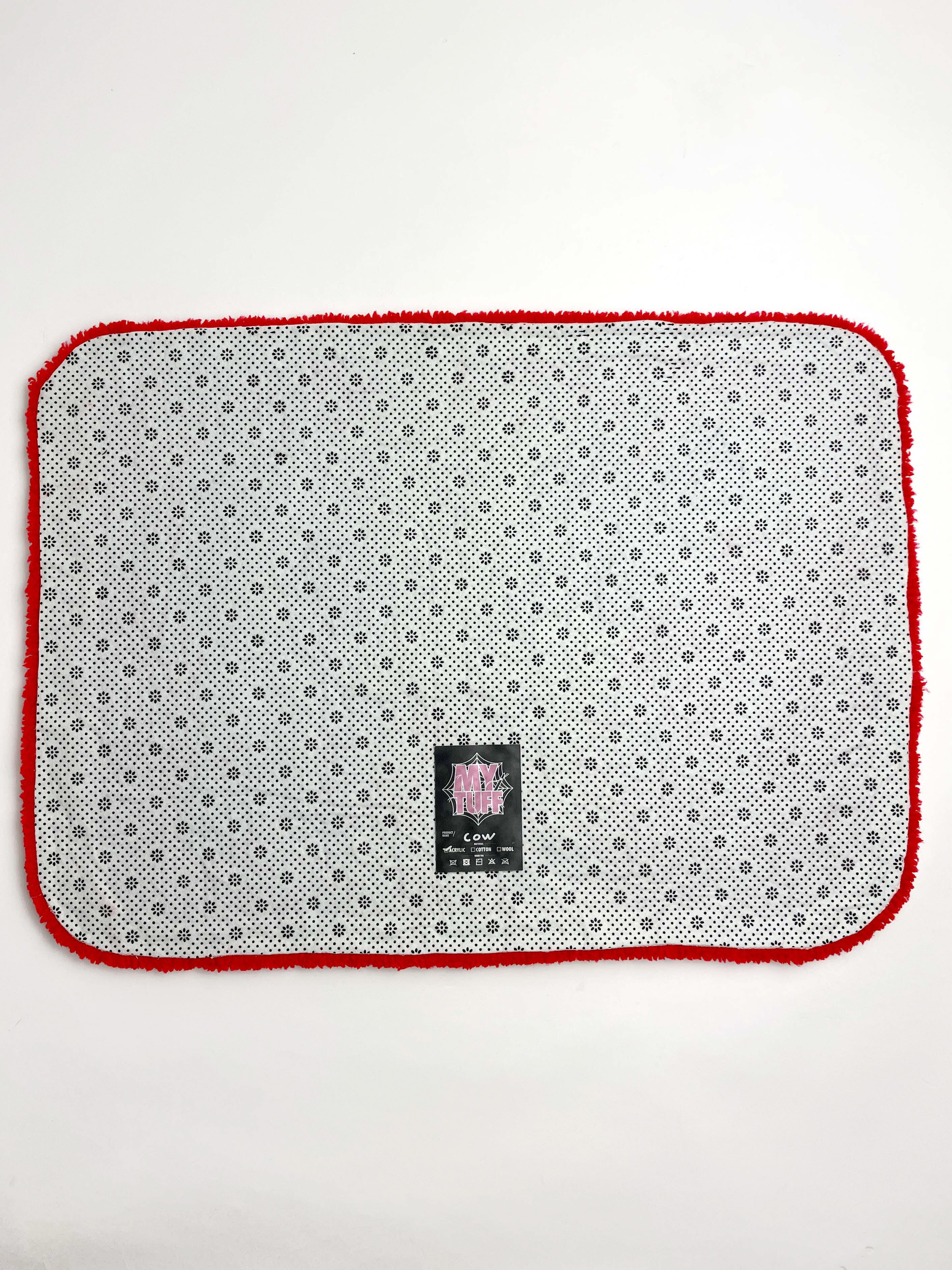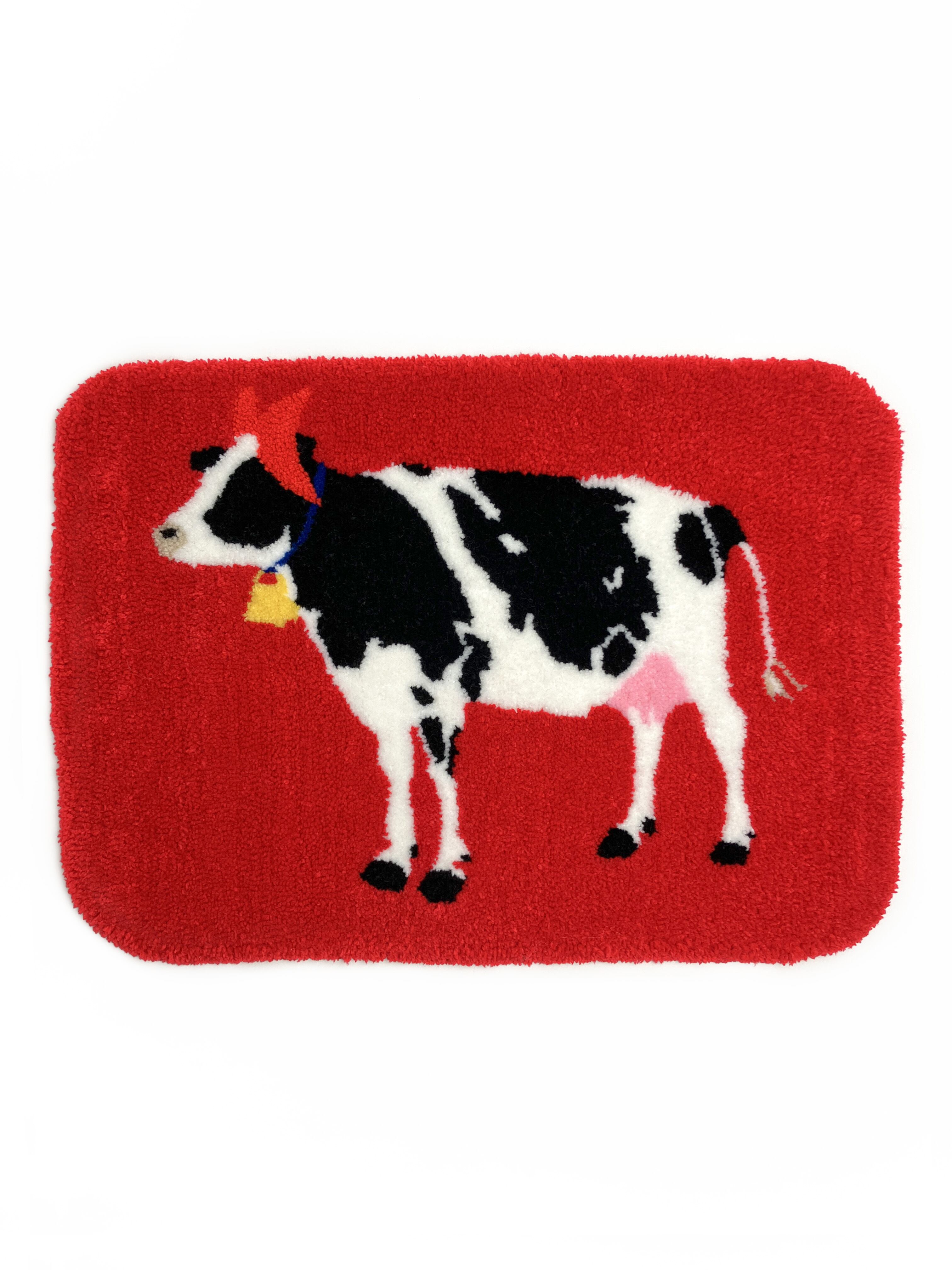 赤いリボンをつけたホルスタインのハンドメイドラグです。